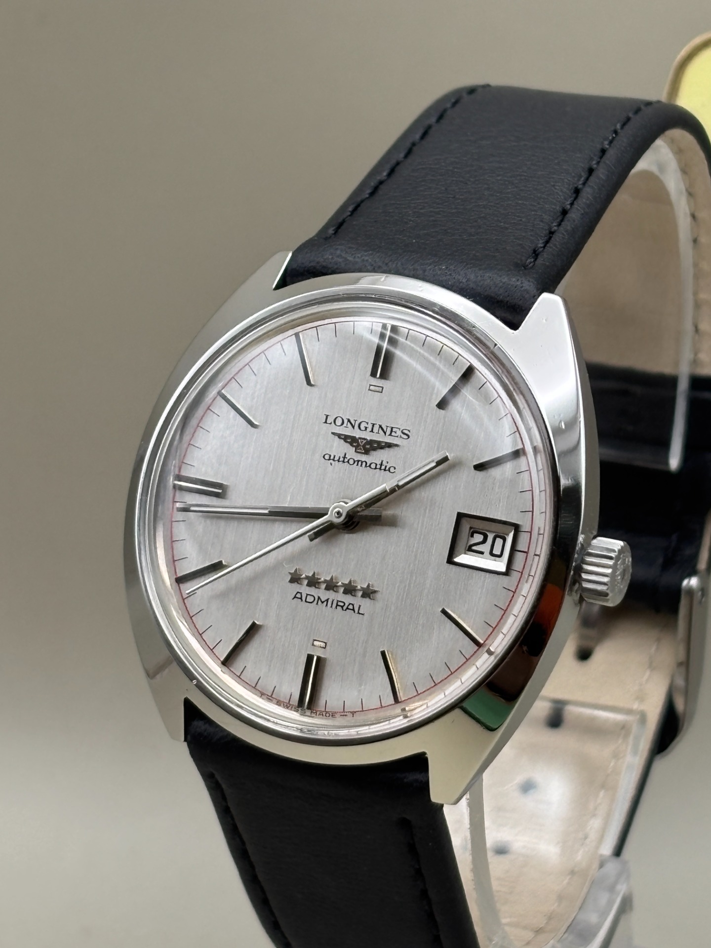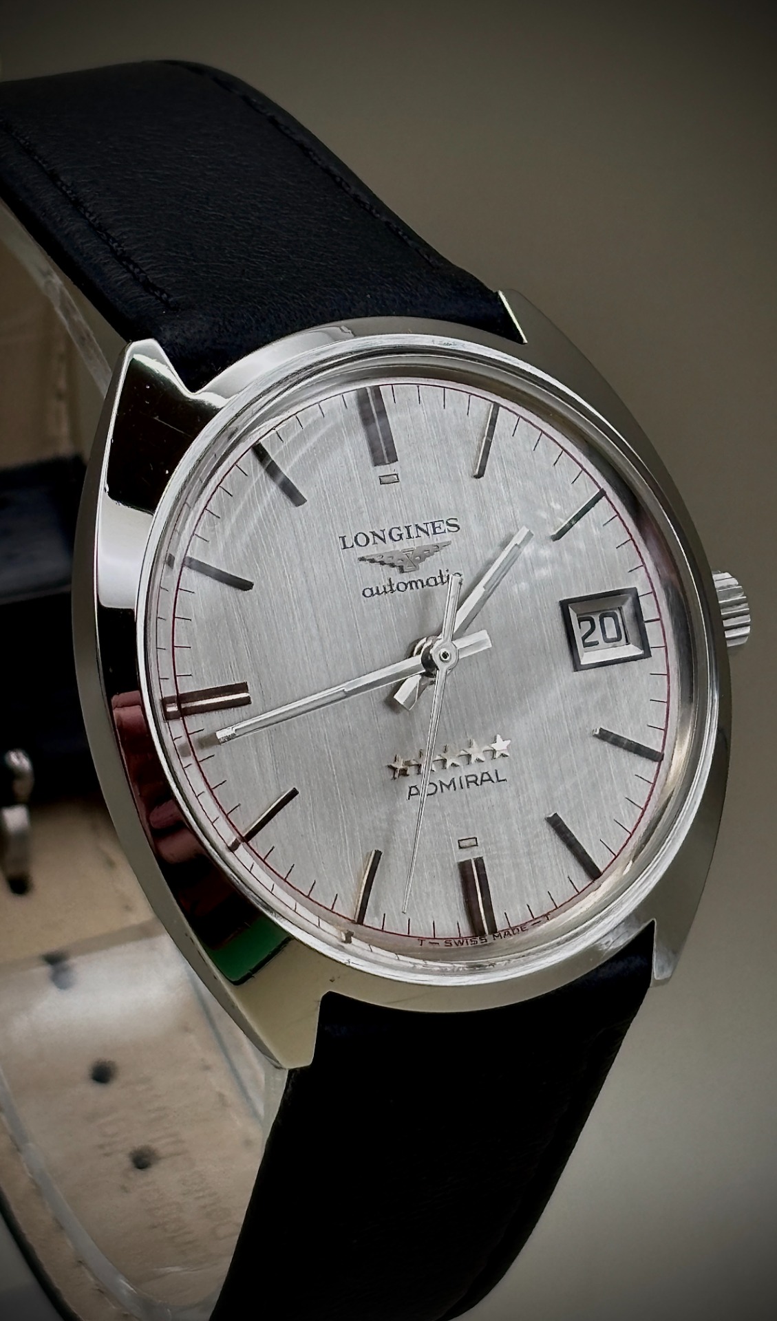 Erg mooie vintage Longines Admiral 8342‑3, een model uit de jaren '70 met de kenmerkende kastvorm en de zeldzame wijzerplaat met rode track‑lijn.