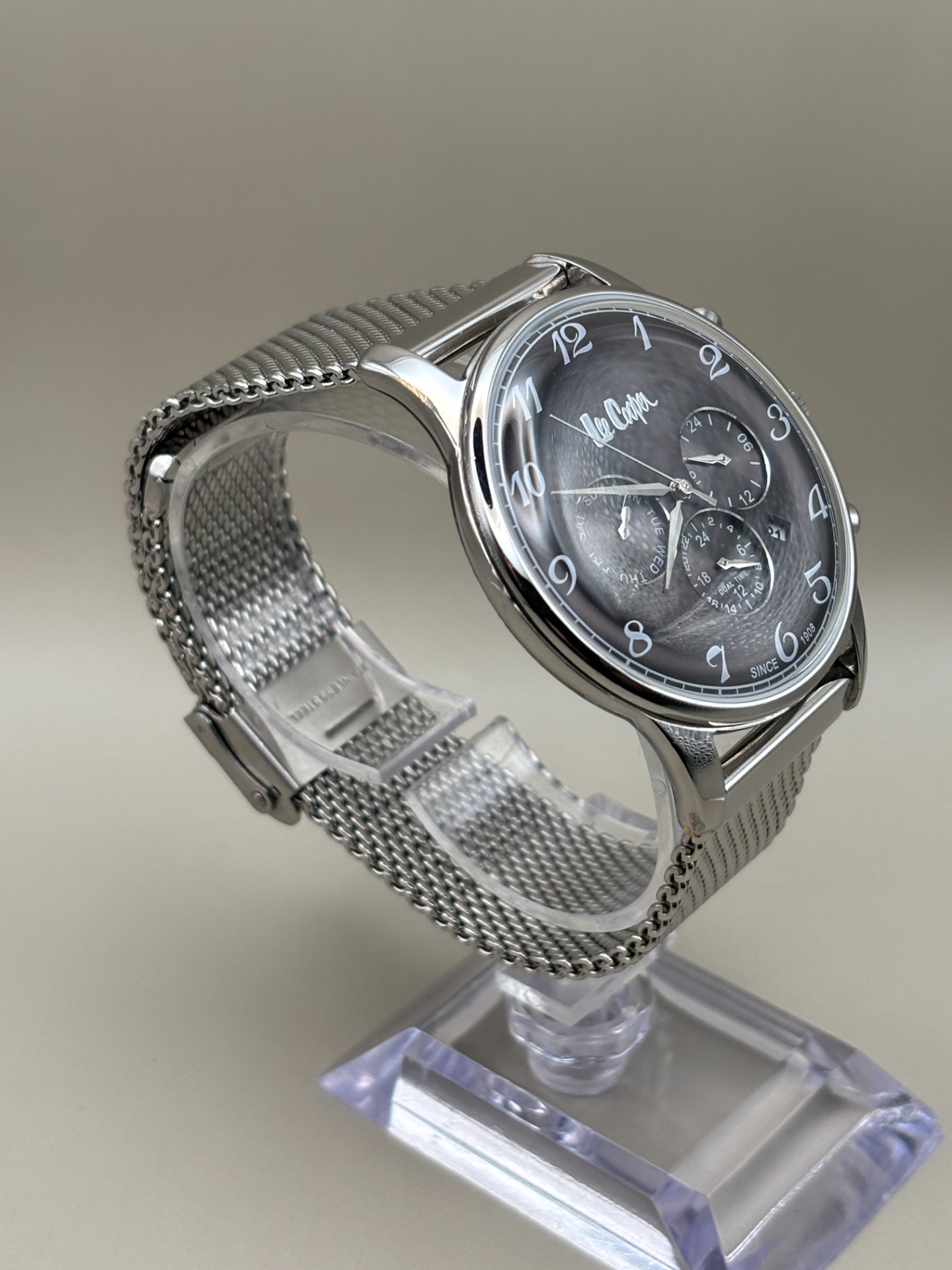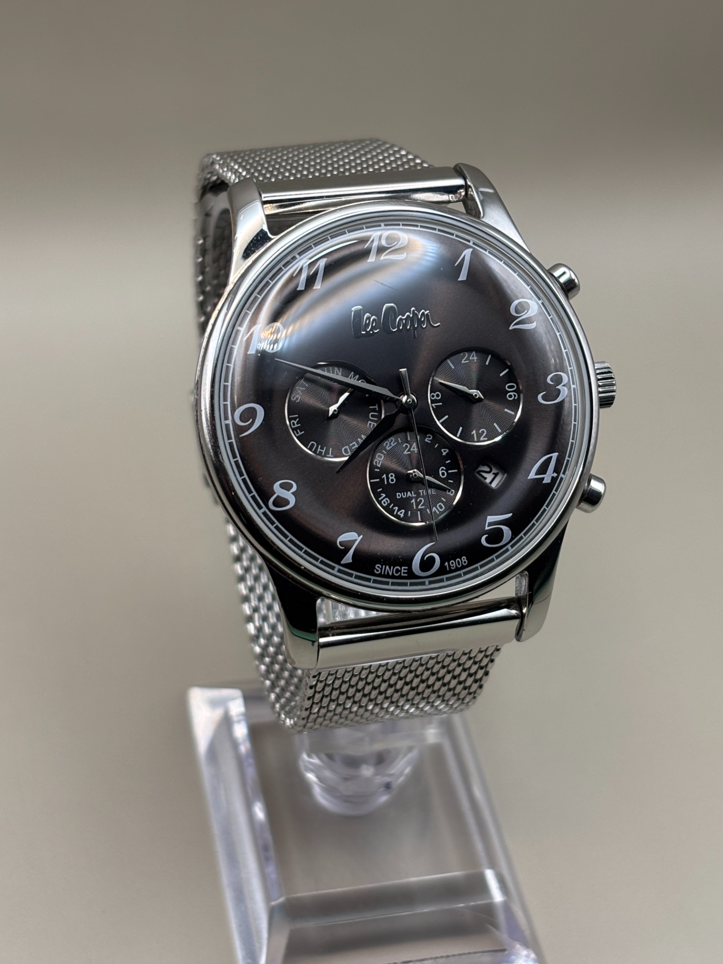 Dit horloge verkeert in nette gebruikte staat. Het glas heeft een minimaal krasje, nauwelijks zichtbaar bij normaal gebruik. De kast en band vertonen lichte sporen van dragen, passend bij zorgvuldig gebruik.