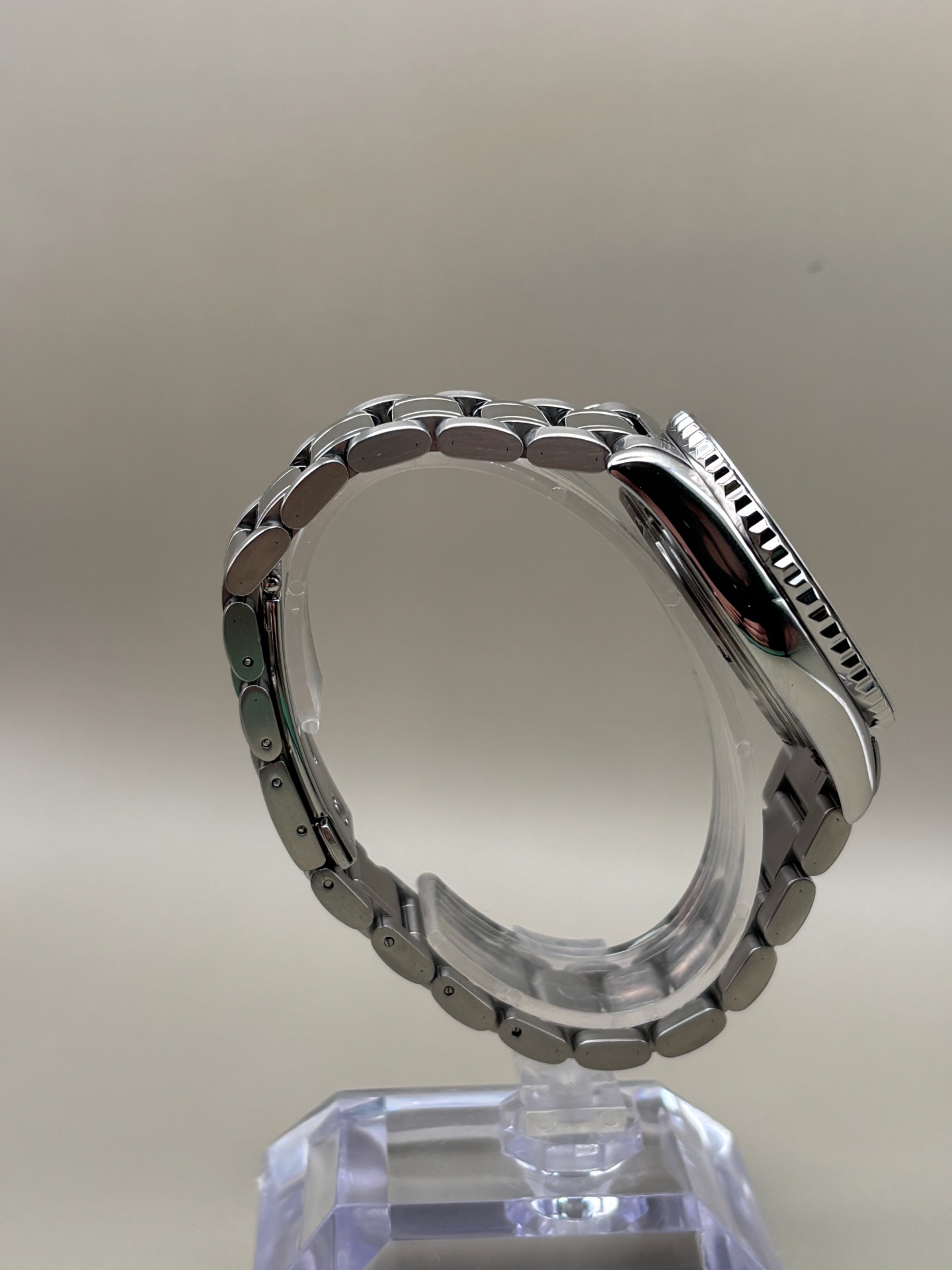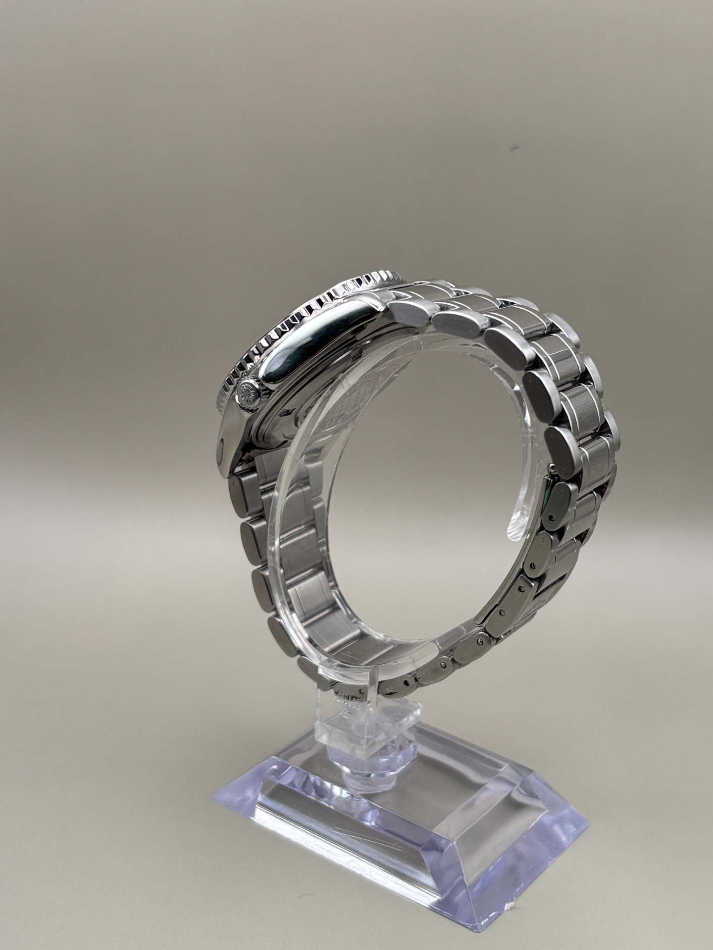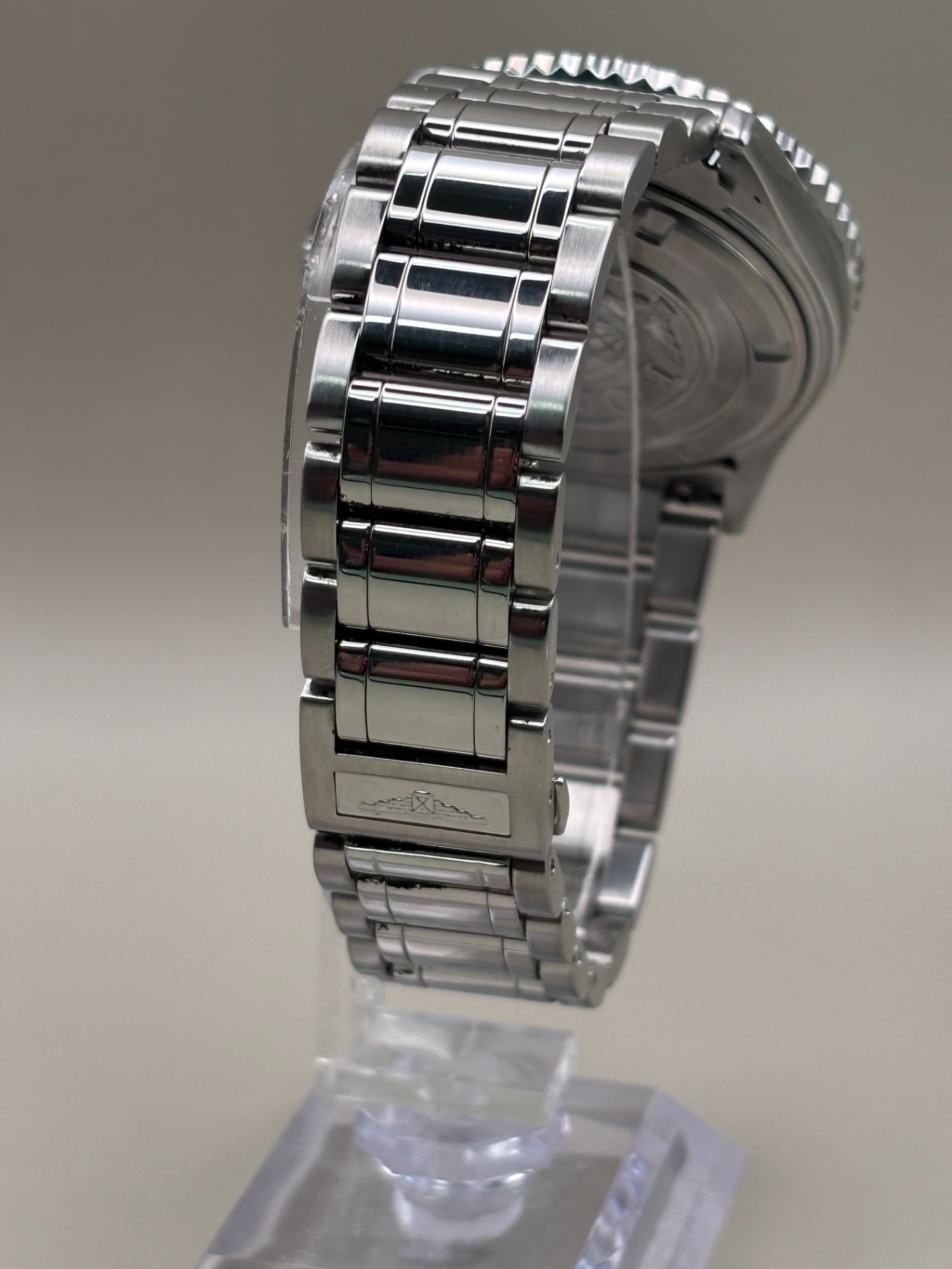 De kast en band zijn zorgvuldig opgefrist en ultrasoon gereinigd. Alle pakkingen zijn vervangen en het horloge is succesvol getest op waterdichtheid tot 100 meter — de testuitdraai wordt meegeleverd.
